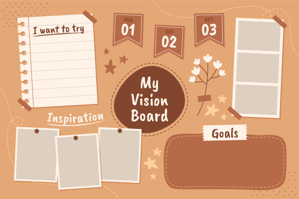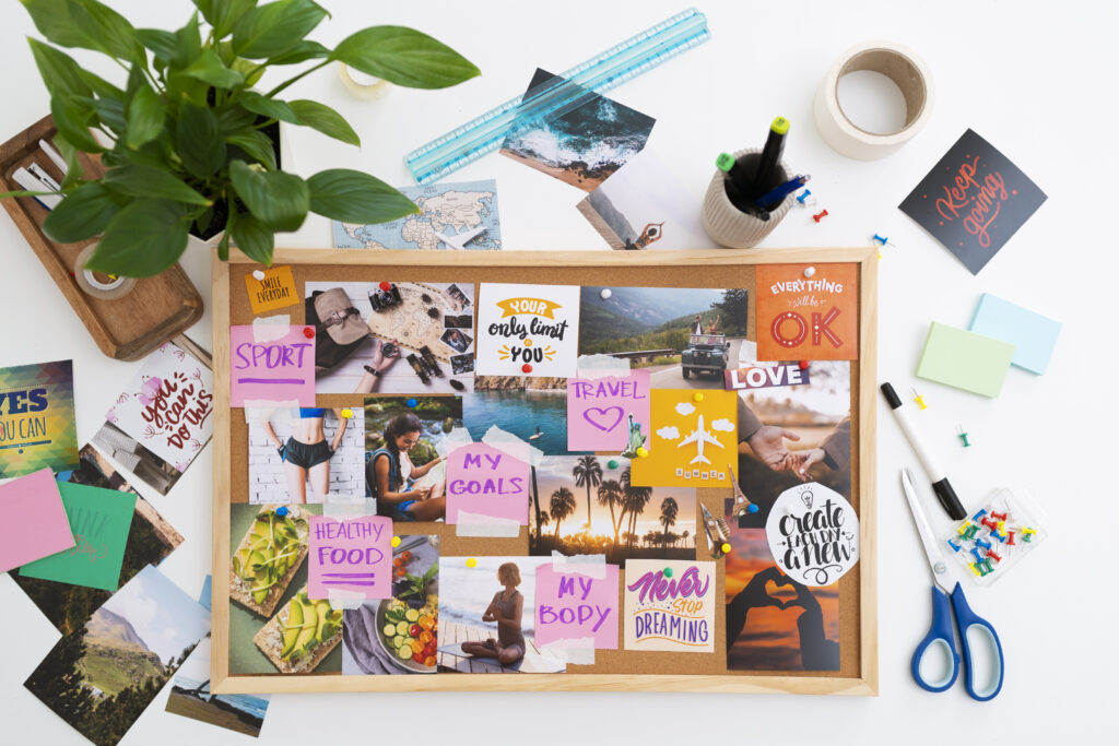 A vision board is a collage of images, words, and other materials that represent the goals and dreams you wish to achieve in your life. Often displayed in a place where you can see it daily, a vision board serves as a visual reminder of what you’re working towards. By focusing on these visual elements, you can reinforce positive thinking and motivation.